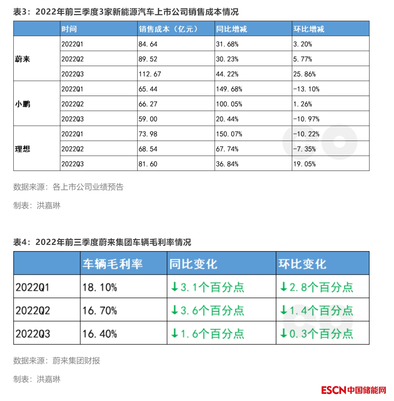 蔚來集團財報顯示,2022年第三季度其銷售成本為112.67億元,較2021年第三季度增長44.2%,主要原因是汽車交付量增加和單車電池成本增加。2022年一至三季度,蔚來集團的季度車輛毛利率同比和環(huán)比均出現下滑,單車電池成本增加仍是重要原因。