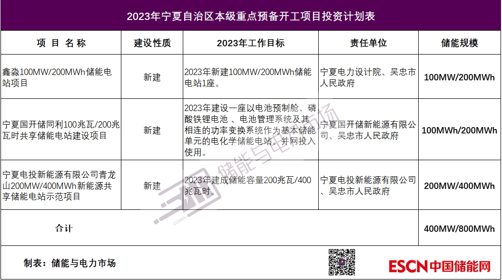 6個重點建設的儲能項目+3個重點預備開工儲能項目,寧夏2023年重點項目總計包含9個儲能項目,總規(guī)模1.45GW/ 3.3GWh;其中,2023年至少將建成獨立儲能電站4座,涉及儲能總規(guī)模500MW/1000MWh。