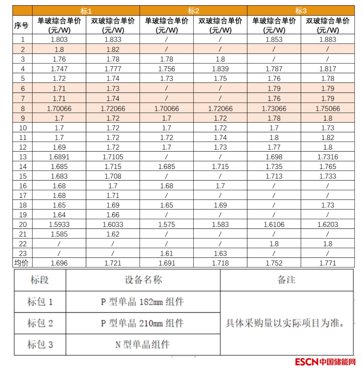 其中標(biāo)包1為P型單晶182mm組件,標(biāo)包2為P型單晶210mm組件,標(biāo)包3為N型單晶組件,具體情況如下: