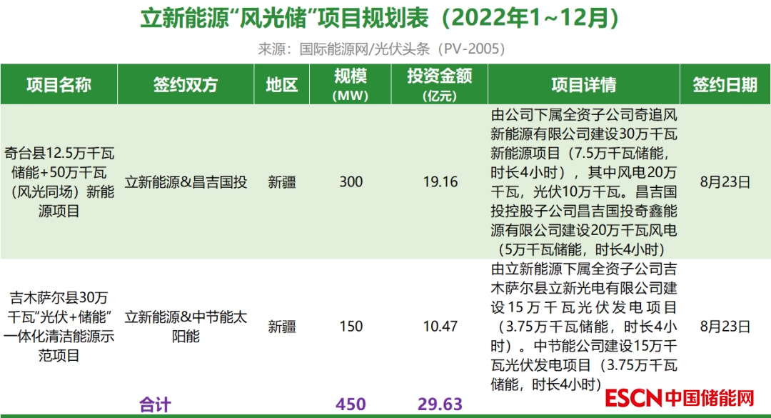 截至截至2022年12月31日,立新能源共簽約(規(guī)劃)2個風光儲項目,其中已明確項目規(guī)模為450MW,投資金額為29.63億元。
