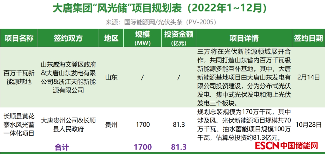 截至2022年12月31日,大唐集團共簽約(規(guī)劃)2個風光儲項目,明確規(guī)模共計1.7GW,明確投資金額81.3億元。