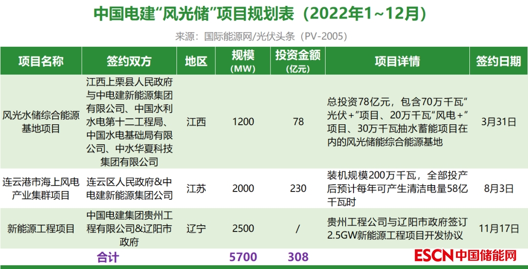截至2022年12月31日,中國電建共簽約(規(guī)劃)3個風光儲項目,其中已明確項目規(guī)模為5.7GW,明確投資金額308億元。
