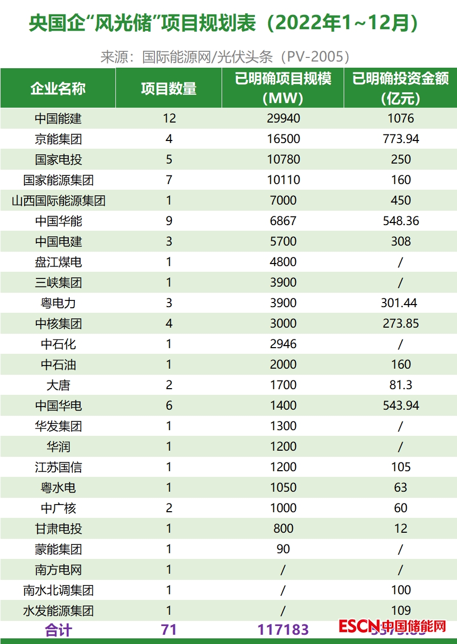 初步統(tǒng)計,中國能建、京能集團、國家電投、國家能源集團、山西國際能源集團、中國華能、中國電建、盤江煤電、三峽集團、粵電力、中核集團、中石化、中石油、大唐集團、中國華電、華發(fā)集團、華潤、江蘇國信、粵水電、中廣核、甘肅電投、蒙能集團、南方電網(wǎng)、南水北調(diào)集團、水發(fā)能源集團25家央國企簽約風光儲項目71個,項目規(guī)劃規(guī)模117.183GW,投資總額5375.83億元。在已明確的項目規(guī)模中,中國能建以29.94GW排名第一,京能集團以16.5GW排名第二,國家電投以10.78GW位列第三。國家能源集團、山西國際能源集團、中國華能、中國電建、盤江煤電、三峽集團、粵電力、中核集團、中石化、中石油簽約規(guī)模均超2GW。