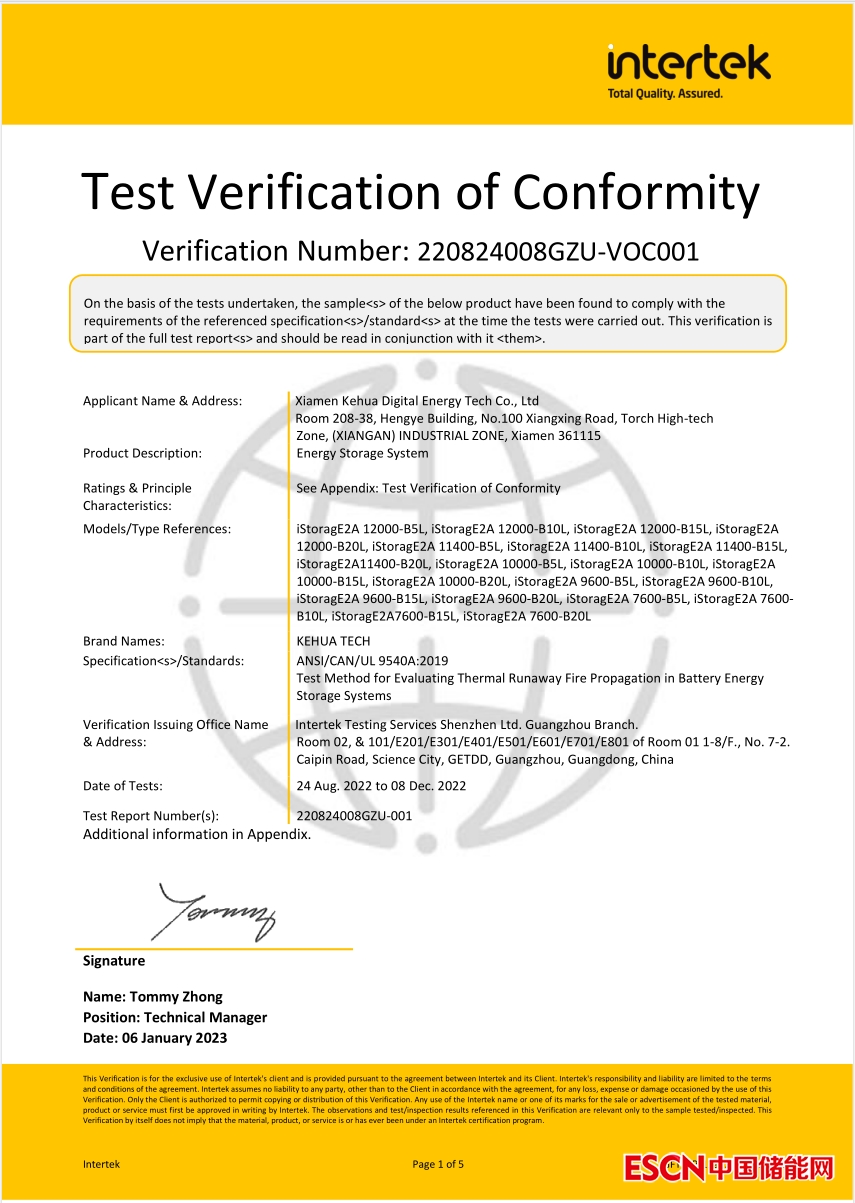 中國儲(chǔ)能網(wǎng)訊:近日,廈門科華數(shù)能科技有限公司(簡稱“科華數(shù)能”)iStoragE2A系列戶用儲(chǔ)能解決方案產(chǎn)品順利通過 UL9540、UL9540A、UL1973、UL1741、UL1998等系列安全測(cè)試,獲得Intertek天祥集團(tuán)(以下簡稱“Intertek”)授予認(rèn)證證書,為科華數(shù)能產(chǎn)品順利進(jìn)軍國際市場(chǎng)提供強(qiáng)有力保障。