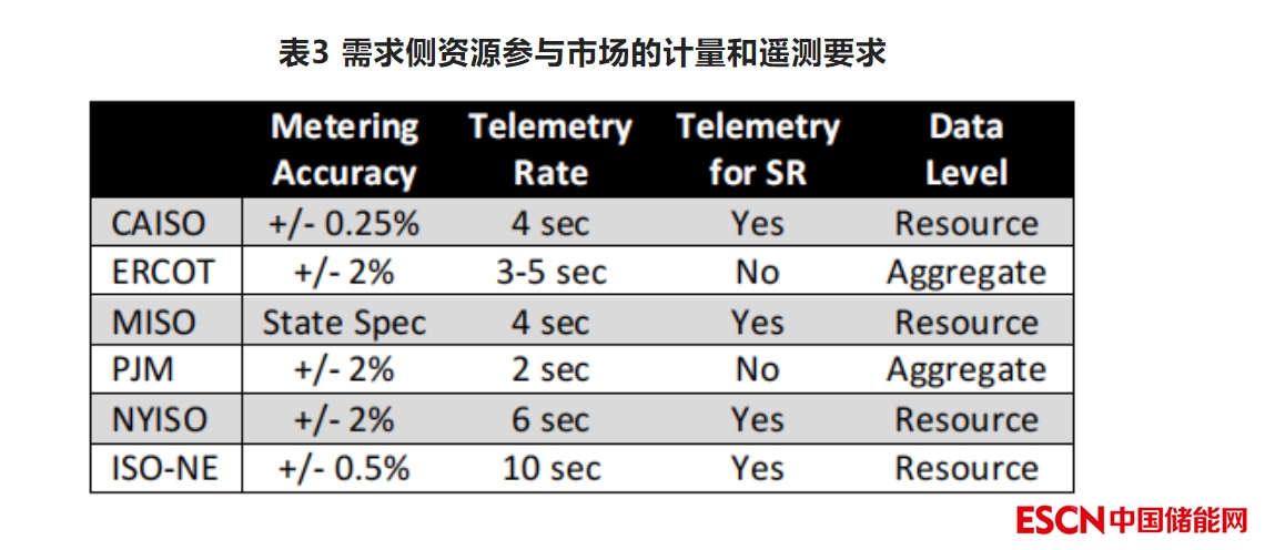 由于需求側(cè)資源比傳統(tǒng)的發(fā)電機(jī)要小得多,使同規(guī)模的需求側(cè)資源在參與輔助服務(wù)市場(chǎng)時(shí)達(dá)到與傳統(tǒng)資源一樣的計(jì)量和遙測(cè)標(biāo)準(zhǔn),可能會(huì)花費(fèi)更多成本。表3顯示各個(gè)市場(chǎng)中的有關(guān)要求。