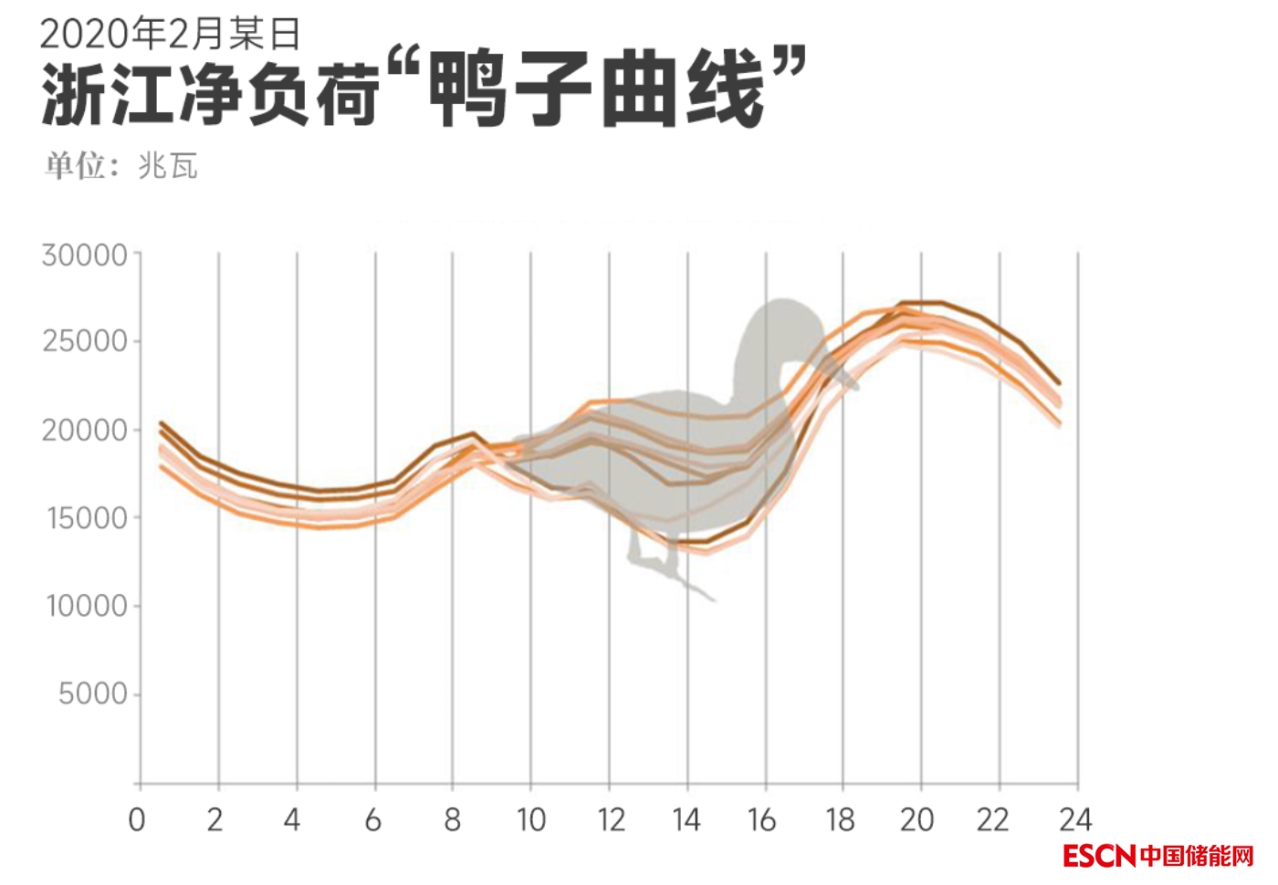 電網(wǎng)的日內(nèi)凈負(fù)荷呈現(xiàn)“鴨子曲線”特征。早上,隨著光伏開(kāi)始發(fā)電,凈負(fù)荷下降(鴨尾巴)。當(dāng)中午太陽(yáng)最強(qiáng)的時(shí)候,凈負(fù)荷達(dá)到最低點(diǎn)(鴨的腹部)。在傍晚時(shí)分,隨著光照的下降,凈負(fù)荷迅速上升(鴨脖子)。夜間用電負(fù)荷需求逐漸下降,凈負(fù)荷也開(kāi)始下降(鴨頭)。