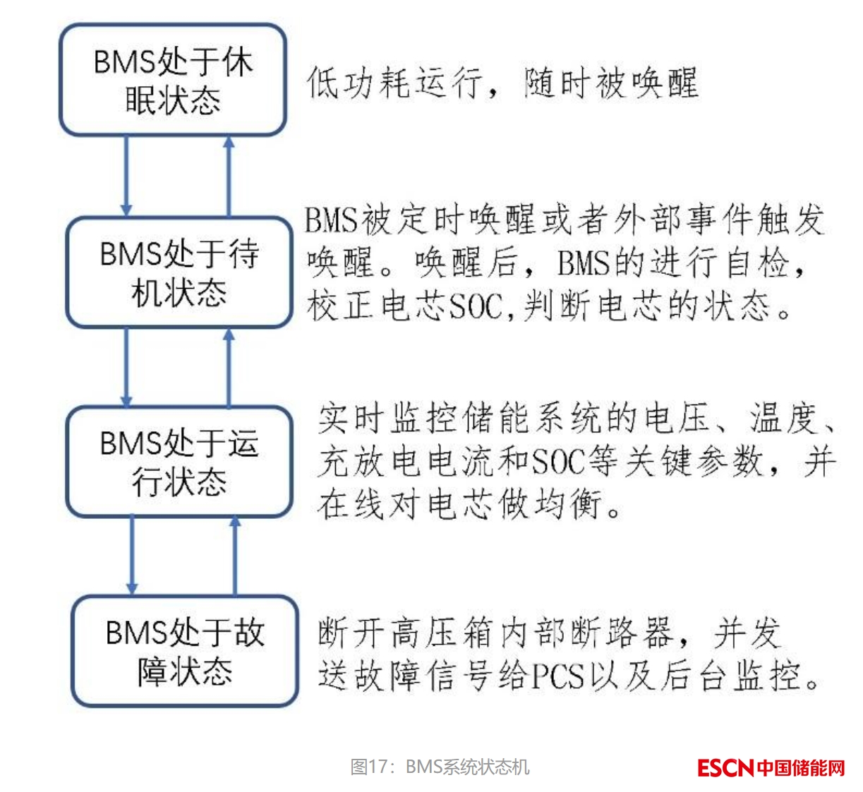 即使電池系統(tǒng)在不運(yùn)行的狀態(tài),將BMS從睡眠模式定期喚醒也是非常有必要的。一是為了更準(zhǔn)確地估計(jì)荷電狀態(tài)并對電芯做相應(yīng)的均衡;二是可以對電池進(jìn)行各種缺陷的檢測,包括自放電等。圖17給出了BMS系統(tǒng)運(yùn)行狀態(tài)機(jī)的示例。