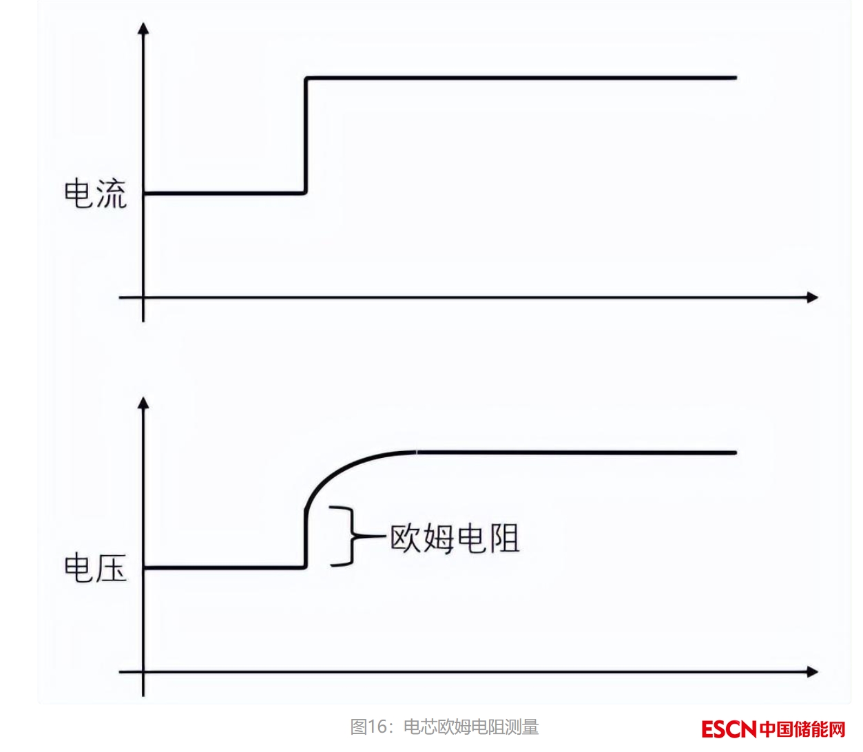 此外,SOH值和內(nèi)部阻抗值存在一定的關(guān)系,可以通過測試內(nèi)部阻抗來估算SOH值。我們可以用線性最小二乘法擬合一系列電壓和電流有序?qū)?,從而獲得相對比較精確的直流歐姆阻抗估測值。利用最小二乘法得出的回歸線的斜度等于阻抗,而回歸線的截距則代表非IR電壓值。此外,檢測電流的階躍變化近似值,還可以測量相應(yīng)的瞬時(shí)電壓變化。DeltaV/DeltaI的比值可用于計(jì)算該處的歐姆電阻,如圖16所示。