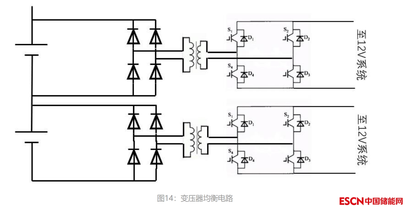 圖12所示電容均衡電路,在S1a閉合的情況下,電芯1給C12電容進(jìn)行充電,然后關(guān)閉S1a,閉合S1b,C12給電芯2進(jìn)行充電。因此通過電容的中介來對電芯中不平衡的電量進(jìn)行轉(zhuǎn)移。這樣的均衡電路只能從電壓高的電芯轉(zhuǎn)移到電量低的電芯。但在實(shí)際過程中,我們希望依據(jù)SOC值來進(jìn)行均衡,即有的電芯由于他容量比較少,所以電壓變化很快,在一個(gè)時(shí)刻它的電壓高,但在下個(gè)時(shí)刻它的電壓就會(huì)下降的很快,在這樣的情況下,我們不希望進(jìn)行電量的轉(zhuǎn)移。此外,開關(guān)順序的錯(cuò)誤會(huì)導(dǎo)致安全問題。