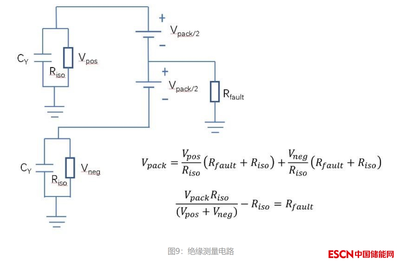在儲(chǔ)能系統(tǒng)中,電池插箱等帶有絕緣高壓元件與接地/箱體接地之間存在寄生電容和電導(dǎo)。這些寄生元件需要進(jìn)行特別的考慮。因此電池管理系統(tǒng)中應(yīng)該加入離線或在線的絕緣檢測電路。圖9簡單介紹一個(gè)絕緣檢測電路。