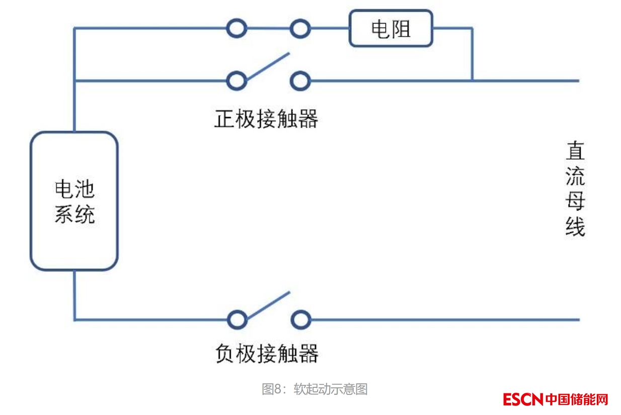 在多支路的儲(chǔ)能系統(tǒng)中,BCMU中需要具有軟起動(dòng)功能或者預(yù)充電功能的電路,以緩解不同簇之間由于壓差過大并聯(lián)在同一個(gè)母線上導(dǎo)致的大環(huán)流。這種環(huán)流會(huì)對接觸器造成較大的傷害。一般情況下,接觸器應(yīng)該在較小的壓差下閉合,直到觸點(diǎn)完全閉合后才應(yīng)流過電流。解決此類問題的最常用的方法就是使用軟起動(dòng)電路(見圖8)。該電路利用一個(gè)電阻和附加接觸器進(jìn)行串聯(lián),然后再并聯(lián)到一個(gè)主接觸器上。