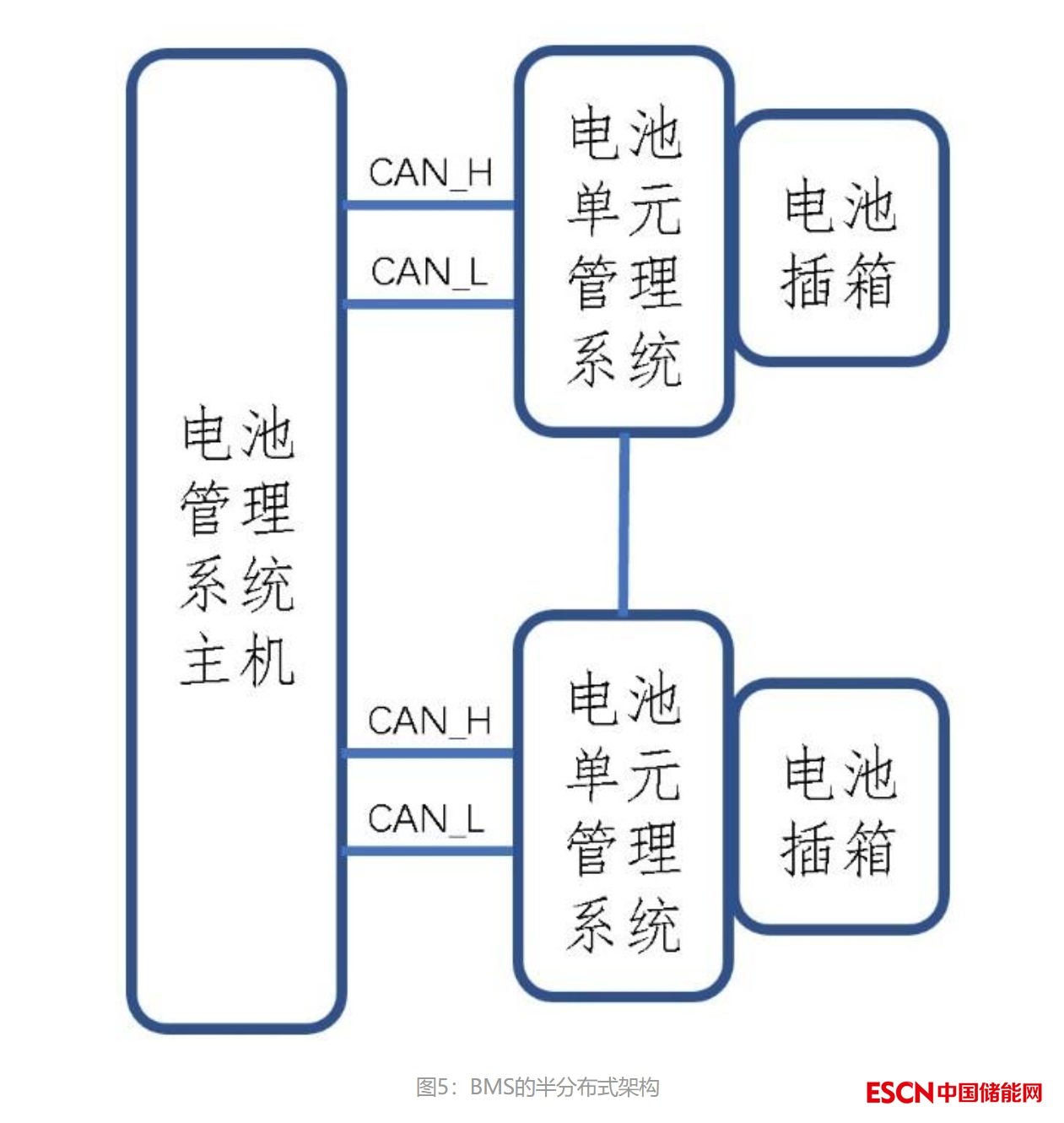 大規(guī)模電化學(xué)儲(chǔ)能BMS的硬件架構(gòu)可分為兩類,第一類為分布式架構(gòu),另一類為半分布式架構(gòu)(見圖5)。分布式體系架構(gòu)已經(jīng)在上一小節(jié)中進(jìn)行了闡述。它的主要特點(diǎn)是高度的模塊化,在今后具有高度集成的系統(tǒng)可能會(huì)將檢測充電電路直接合并到電池模塊中。對于半分布式架構(gòu),其中的電池管理單元對一個(gè)電池插箱負(fù)責(zé),它可以與高壓測量和控制設(shè)備一起操作。該模塊可包含高壓測量,接觸器或繼電器、熔絲和電流傳感器或分流器。這樣的模塊使得系統(tǒng)更容易進(jìn)行縮放。