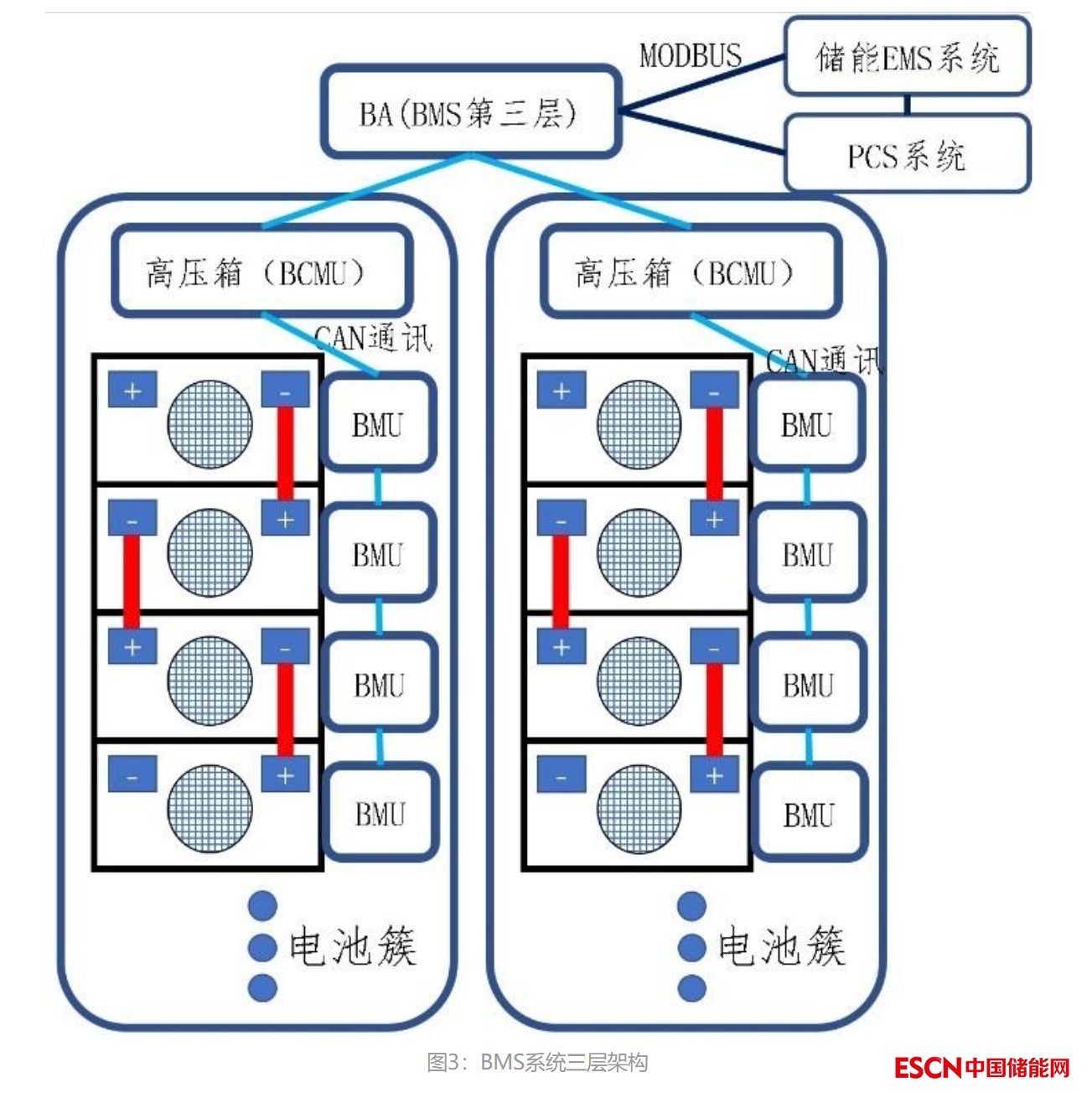 根據(jù)電池系統(tǒng)的整體架構(gòu),BMS的系統(tǒng)架構(gòu)也是相對應(yīng)的(見圖3)。一般來說,大規(guī)模電化學(xué)儲(chǔ)能BMS系統(tǒng)分為三層架構(gòu)。最底層架構(gòu)為BMU,即每一個(gè)電池插箱都會(huì)配置一個(gè)BMU系統(tǒng),BMU系統(tǒng)通過電壓和溫度采集線采集插箱內(nèi)每顆電芯的電壓和溫度,同時(shí)BMU系統(tǒng)接收簇管理單元(BCMU)系統(tǒng)下發(fā)的指令,控制插箱內(nèi)風(fēng)扇的啟停。此外,BMU裝置還會(huì)通過均衡線束對插箱內(nèi)的電芯進(jìn)行主動(dòng)均衡,此類均衡電流一般為3A-5A。