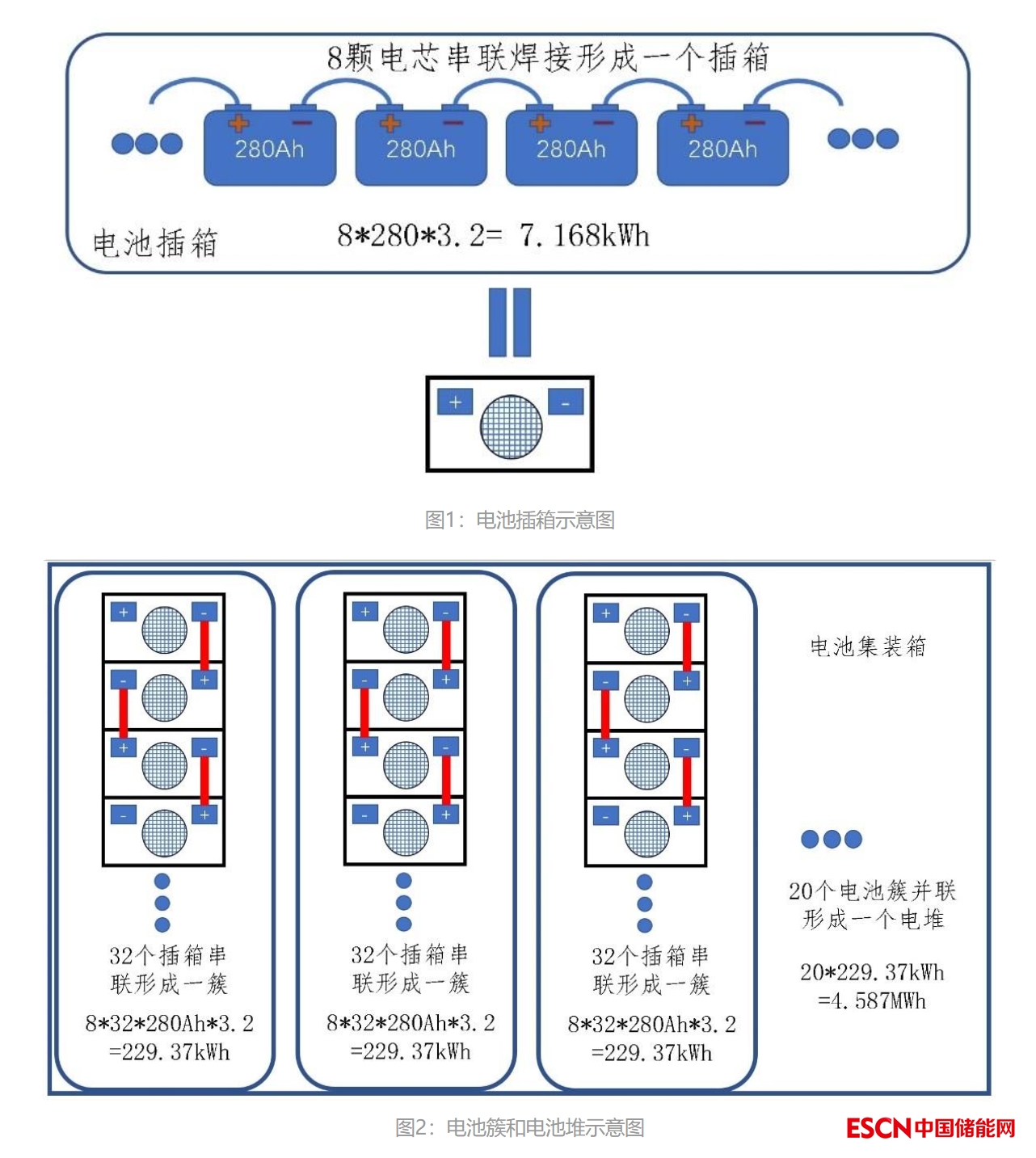 電化學(xué)儲(chǔ)能的最小單元為電芯,以磷酸鐵鋰電芯為例,其電壓為3.2V,現(xiàn)主流儲(chǔ)能電芯的容量為120Ah-280Ah。對于大規(guī)模電化學(xué)儲(chǔ)能系統(tǒng)來說,整個(gè)架構(gòu)可以分為3個(gè)部分,第一個(gè)部分為電池插箱部分,即把電芯進(jìn)行串聯(lián)放入到一個(gè)殼體當(dāng)中,這個(gè)殼體我們稱為電池插箱(見圖1),電池插箱內(nèi)的電芯通過鋁排進(jìn)行串聯(lián)焊接。電池管理系統(tǒng)的最底層控制單位(BMU)就是用來監(jiān)測插箱內(nèi)的每顆電芯。第二部分為電池簇部分,即把多個(gè)電池插箱進(jìn)行串聯(lián)形成一個(gè)電池簇。電池簇的電壓要達(dá)到變流器(PCS)所需要的電壓。目前,主流的電力變流器分為1000V和1500V直流系統(tǒng)。對于1000V系統(tǒng),需要將256顆280Ah的電芯進(jìn)行串聯(lián)形成一簇電池,即需要256/8=32個(gè)插箱進(jìn)行串聯(lián)。插箱之間的串聯(lián)可以使用銅排連接,這樣的串聯(lián)方式下一簇電池的容量為256*280Ah*3.2 = 229.37kWh。這一層對應(yīng)于電池管理單元的第二層控制單元(BCMU)即為電池簇管理單元。第三部分為電池堆管理部分,即把多個(gè)電池簇并聯(lián)在一起形成一個(gè)大的儲(chǔ)能電堆。例如把20簇電池并聯(lián)在一起,放入到一個(gè)集裝箱內(nèi),則這個(gè)集裝箱的電池容量為229.37kWh*20 =4.587MWh。對于一個(gè)100MWh的電化學(xué)儲(chǔ)能系統(tǒng),需要22個(gè)集裝箱。電堆是由電池管理系統(tǒng)的第三層控制單元(BA)進(jìn)行控制。圖2展示了電池簇和電池堆示意圖。