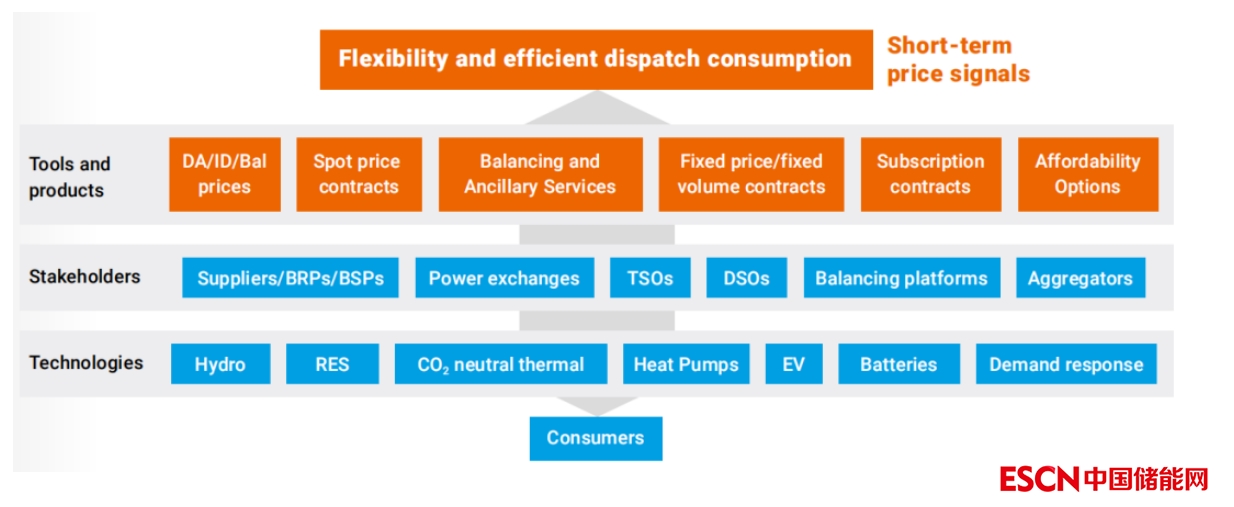 為了增加能源系統(tǒng)的短期靈活性,日前、日內(nèi)和平衡價(jià)格信號(hào)對(duì)于確保發(fā)電和能源消耗的高效調(diào)度、優(yōu)化綜合能源系統(tǒng)至關(guān)重要。為了滿足未來靈活性資源組合的需求,短期市場將需要逐步更接近實(shí)時(shí)地運(yùn)行,采用更短的結(jié)算期,消除對(duì)市場進(jìn)入和價(jià)值堆疊的障礙。