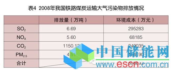 根據(jù)《中華人民共和國鐵道部2008年鐵道統(tǒng)計(jì)公報(bào)》,2008年全國鐵路貨物發(fā)送量完成329035萬噸,煤炭運(yùn)量完成169146萬噸,占51.41%。全國鐵路貨物周轉(zhuǎn)量為23360.32億噸公里,煤炭周轉(zhuǎn)量為8360.28億噸公里。根據(jù)鐵道部統(tǒng)計(jì)中心得出的鐵路運(yùn)輸大氣污染排放因子,可計(jì)算出2008年我國煤炭鐵路運(yùn)輸?shù)奈廴疚锱欧帕浚Y(jié)合前文計(jì)算出的大氣污染物環(huán)境成本,可得煤炭鐵路運(yùn)輸?shù)沫h(huán)境成本,如表4所示。2008年我國火力發(fā)電總量為278573680.4萬千瓦時,由此可計(jì)算煤炭鐵路運(yùn)輸?shù)沫h(huán)境成本Ce(鐵路運(yùn)輸)=0.0029元/千瓦時。