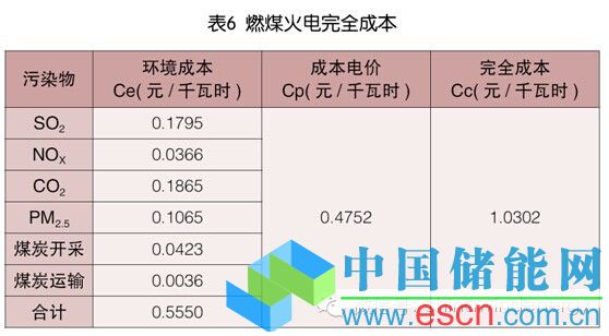 考慮燃煤火電對環(huán)境的污染及破壞帶來的經(jīng)濟(jì)損失后,燃煤火電完全成本Cc(燃煤)為燃煤火電成本電價Cp(燃煤)與燃煤火電環(huán)境成本Ce(燃煤)之和,見公式(4),具體數(shù)據(jù)如表6所示: