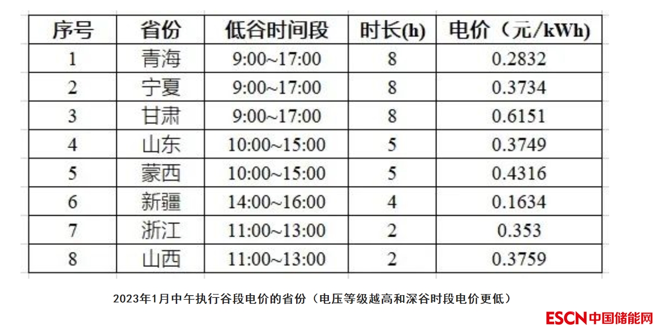 2022年底,多個(gè)省份對(duì)用戶(hù)銷(xiāo)售電價(jià)進(jìn)行調(diào)整,主要調(diào)整了峰、平、谷時(shí)段,拉大了峰谷價(jià)差。根據(jù)各省發(fā)布的電網(wǎng)代理購(gòu)電價(jià)格顯示,至少有8省(區(qū))在中午光伏出力高峰期執(zhí)行谷段電價(jià),具體見(jiàn)下表: