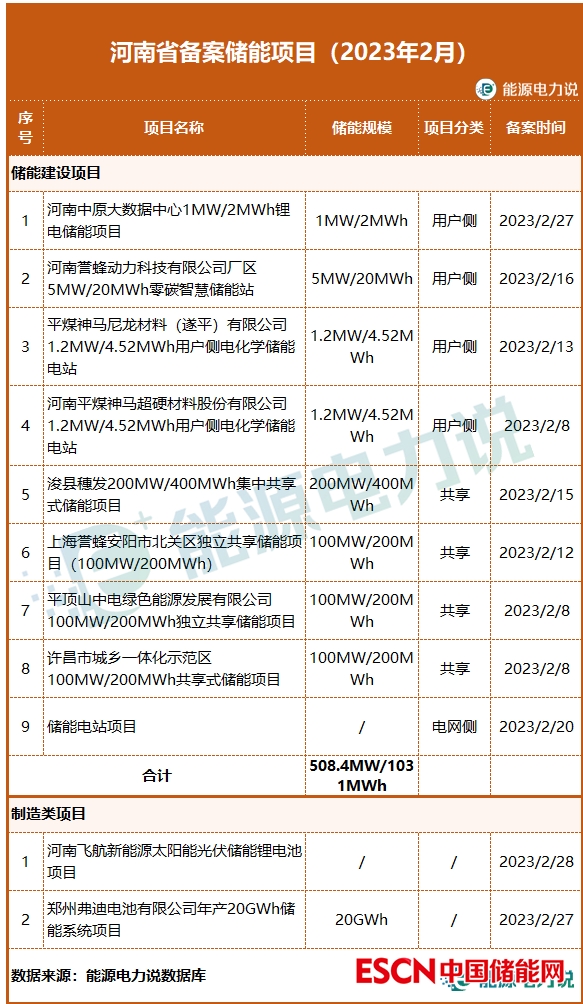 2月,河南省備案儲能項目11個,其中儲能建設(shè)項目9個,儲能產(chǎn)品制造類項目2個,涉及鋰電池、儲能系統(tǒng)的產(chǎn)能項目。9個儲能建設(shè)項目,以用戶側(cè)、電網(wǎng)側(cè)獨立共享儲能為主,合計規(guī)模超1GWh,其中4個獨立儲能項目總規(guī)模達500MW/1000MWh。