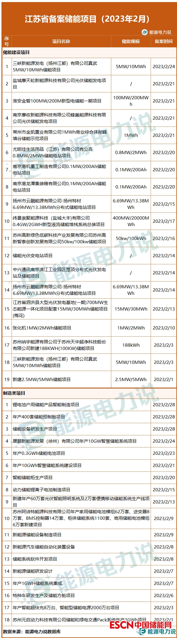 2月,江蘇省備案儲能項目37個,其中儲能建設(shè)項目19個,儲能產(chǎn)品制造類項目18個。