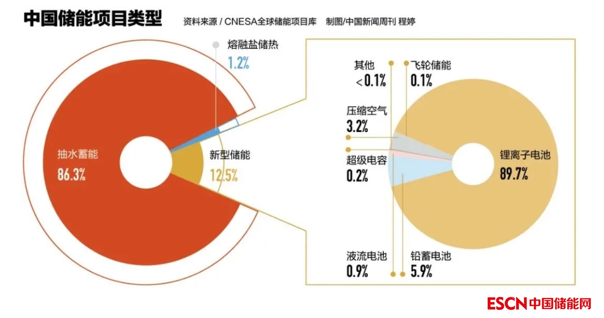 這也給新型儲能帶來機(jī)遇。所謂新型儲能指抽水蓄能以外的其他儲能技術(shù)路線,其中以鋰離子電池為代表的電化學(xué)儲能為主。截至2022年底,全國新型儲能裝機(jī)中,鋰離子電池儲能占比94.5%、壓縮空氣儲能占比2.0%、液流電池儲能占比1.6%、鉛酸(炭)電池儲能占比1.7%、其他技術(shù)路線占比0.2%。