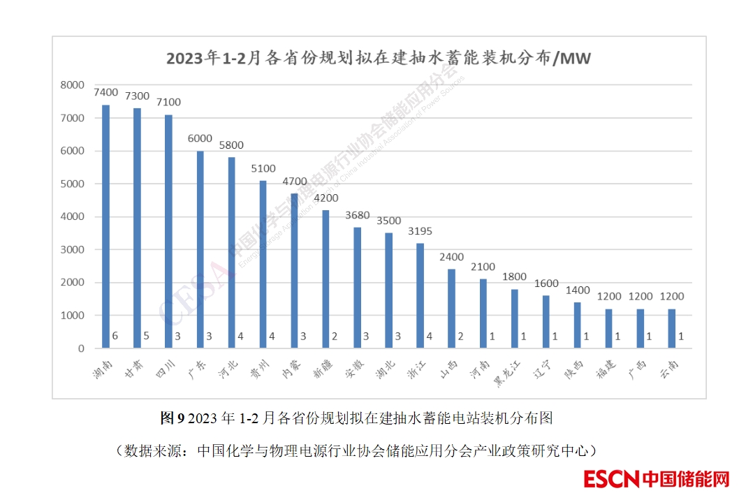 2023年1-2月共有49個抽水蓄能電站項目簽約、通過審核或有新進展,總規(guī)劃規(guī)模達7.0875GW,由圖9可知,抽水蓄能電站規(guī)劃規(guī)模在5GW以上的省份有6個,其中湖南省新規(guī)劃的抽水蓄能電站最多,有6個,規(guī)模也最大,達7400MW;甘肅省5個規(guī)劃中的抽水蓄能電站規(guī)劃規(guī)模僅次于湖南省,達7300MW;四川省抽水蓄能規(guī)劃規(guī)模也突破了7000MW,三個抽水蓄能電站規(guī)劃規(guī)模高達7100MW;廣東省和河北省規(guī)劃規(guī)模在6000MW左右;貴州4個抽水蓄能電站規(guī)模達5100MW。