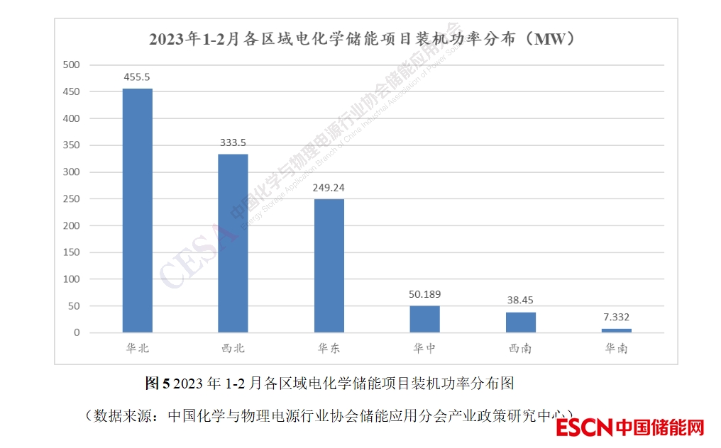 由圖5可知,2023年電化學儲能投運項目裝機主要集中在華北、西北和華東區(qū)域,這一方面在于內蒙、西藏等地集中式新能源儲能項目的投運,另一方面也在于安徽、寧夏等地共享儲能、電網(wǎng)側儲能項目的投運。