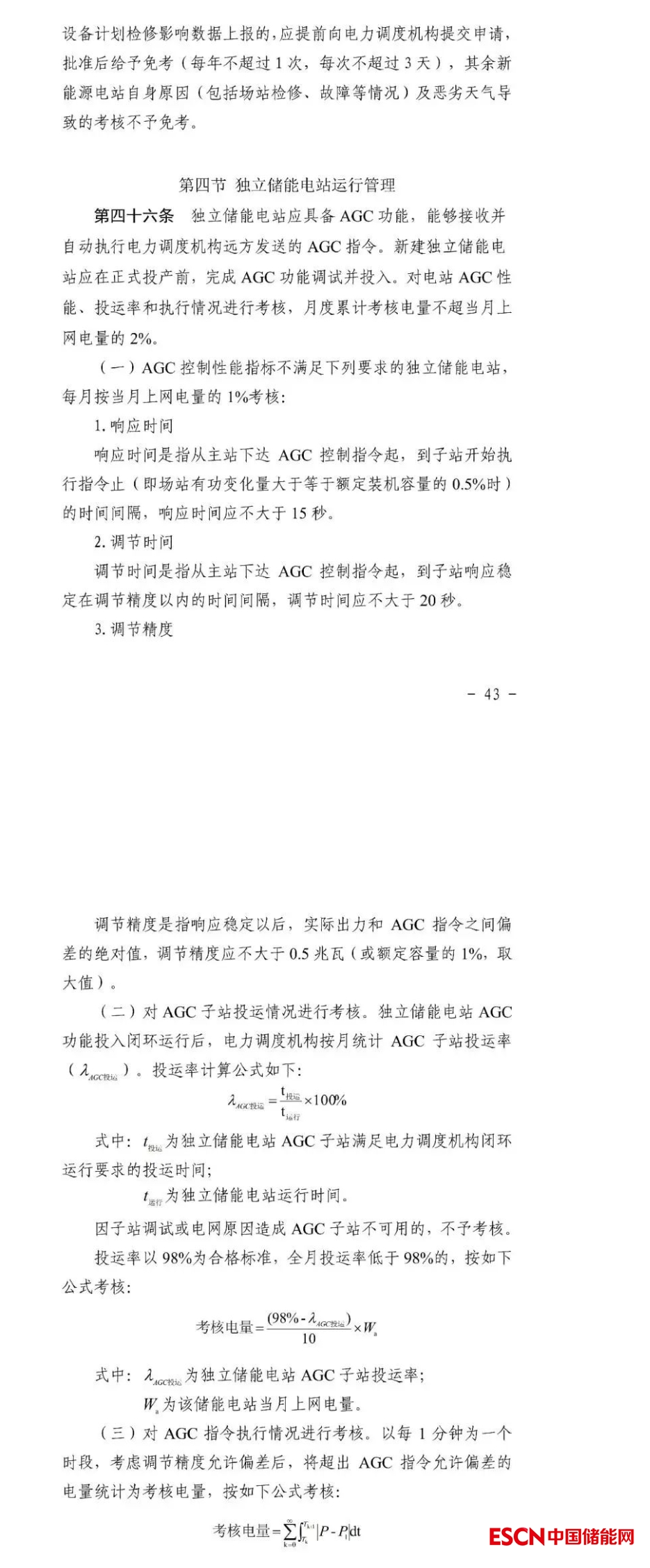 獨立儲能電站應(yīng)具備AGC功能,能夠接收并自動執(zhí)行電力調(diào)度機(jī)構(gòu)遠(yuǎn)方發(fā)送的AGC指令。新建獨立儲能電站應(yīng)在正式投產(chǎn)前,完成AGC功能調(diào)試并投入。對電站AGC性能、投運率和執(zhí)行情況進(jìn)行考核,月度累計考核電量不超當(dāng)月上網(wǎng)電量的2%。
