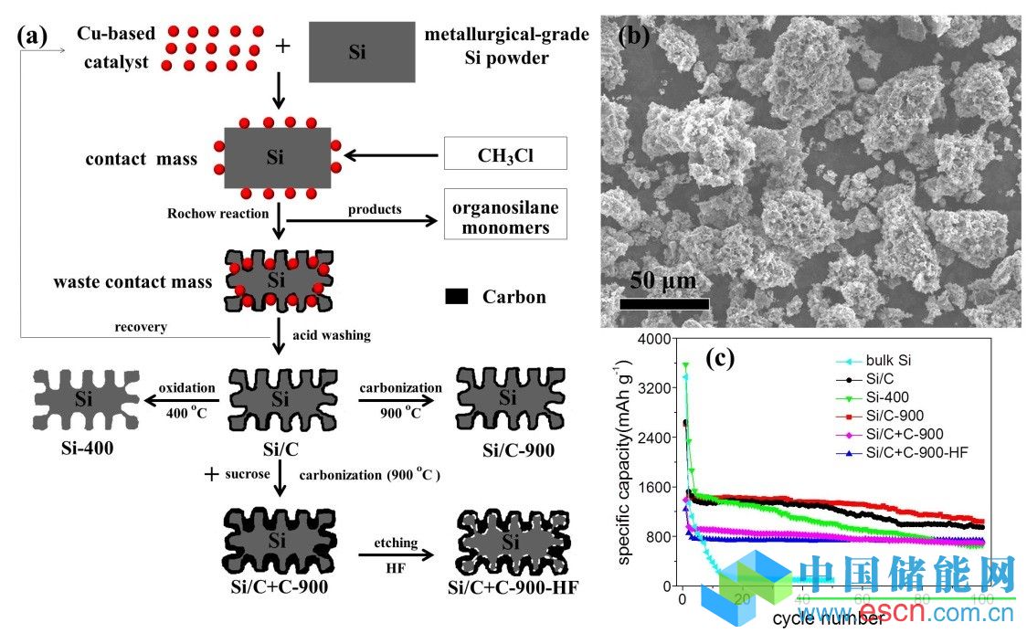 中國儲能網(wǎng)訊:目前廣泛使用的商業(yè)鋰離子電池負極材料主要為石墨,其理論容量為372mAh/g,并且開發(fā)已接近理論值,很難適應未來大容量、高功率、低成本的化學電源的需求,如電動汽車和電網(wǎng)調(diào)峰儲能等等。因此,大量研究瞄準硅基負極材料,因為它具有極高的理論儲鋰容量(4200mAh/g),被認為是最有希望取代目前石墨的下一代負極材料。但是由于硅基材料在充放電過程中發(fā)生巨大的體積變化,導致電池在循環(huán)過程中電極材料會發(fā)生破裂、粉化、結(jié)構(gòu)崩塌等缺點,加上硅的導電性能很低,致使不可逆容量較高、循環(huán)穩(wěn)定性較差。目前研發(fā)工作主要集中在納米、薄膜、多孔、合金、復合等結(jié)構(gòu)的硅基負極材料,但是這些材料的制備方法普遍存在成本高、工藝復雜、設備要求苛刻、批量生產(chǎn)困難等問題,難以規(guī)?;慨a(chǎn)。最近,中國科學院過程工程研究所蘇發(fā)兵研究員領(lǐng)導的能源催化與多孔材料課題組(http://cpme.mpcs.cn/)開發(fā)了一種可規(guī)?;苽涠嗫坠鑿秃县摌O材料的方法,研究結(jié)果發(fā)表在德國應用化學期刊(Angew. Chem. Int. Ed. 2014, 53, 5165-5169)。