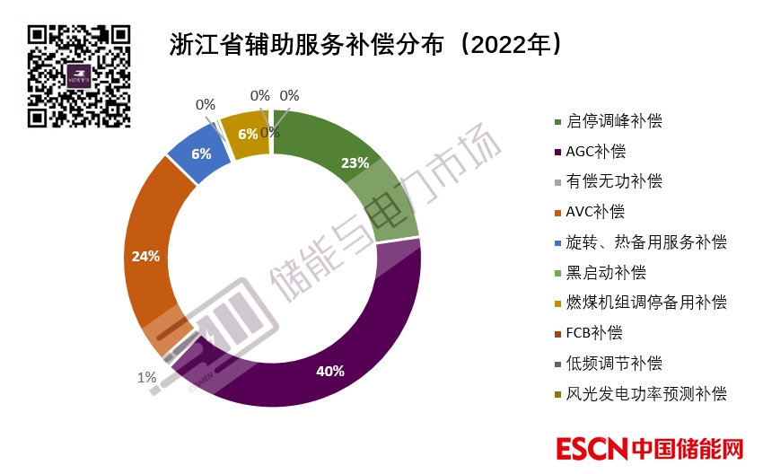2022年浙江省的輔助服務市場運行數(shù)據(jù)顯示,浙江省全年輔助服務補償額為56740萬元,其中AGC調(diào)頻輔助服務補償總量為22409萬元,占比接近40%,是最主要的輔助服務形式。