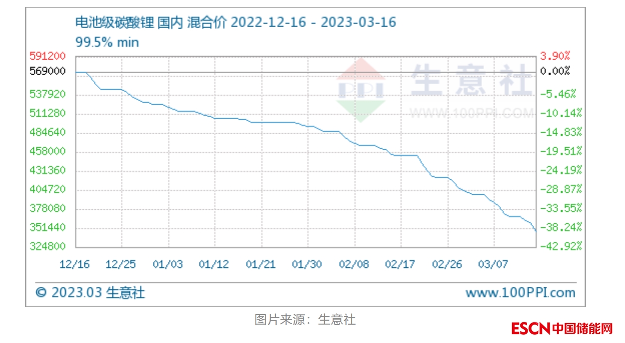 據(jù)生意社最新數(shù)據(jù),3月16日,部分鋰電材料報價繼續(xù)下跌,其中電池級碳酸鋰基準(zhǔn)價為34.7萬元/噸,與本月初相比,下降了14.95%,創(chuàng)下了近一年以來的價格新低。