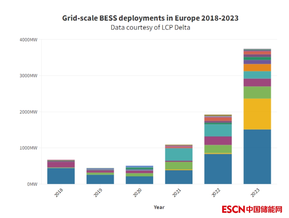 LCP Delta公司將愛爾蘭列為第二大儲(chǔ)能市場,2022年部署了328MW電池儲(chǔ)能系統(tǒng)(17%),其次是德國226MW(12.3%)和法國224MW(11.6%)。因此,這四個(gè)國家的總和占?xì)W洲在2022年部署的1.9GW電池儲(chǔ)能系統(tǒng)的84.4%。