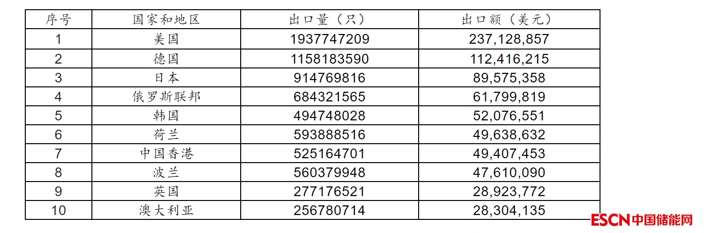 2、2022年鋰離子蓄電池出口前十大目的地(按出口額排序)