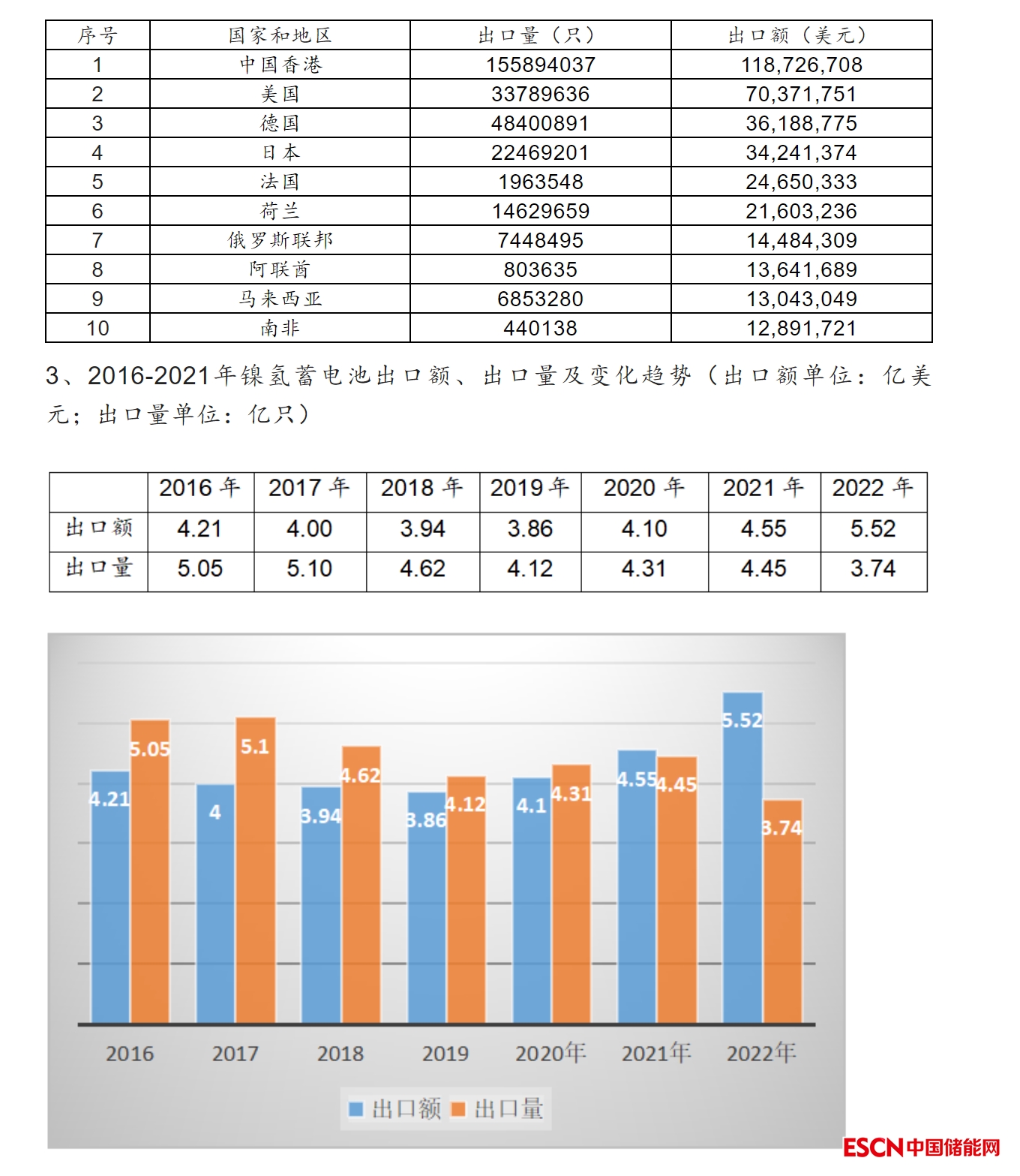1、2022年鎳氫蓄電池出口量為3.74億只,2021年出口量為4.45億只,同比減少了15.96%。2022年鎳氫蓄電池出口額為5.52億美元,2021年出口額為4.55億美元,同比增長(zhǎng)了21.32%。