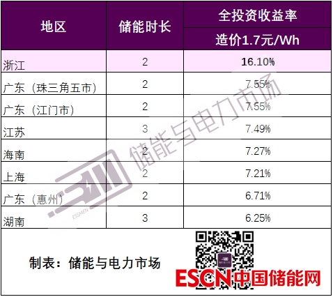 以1.7元/Wh的造價測算,8個區(qū)域全投資收益率超過6%,浙江全投資收益率為16.10%,
