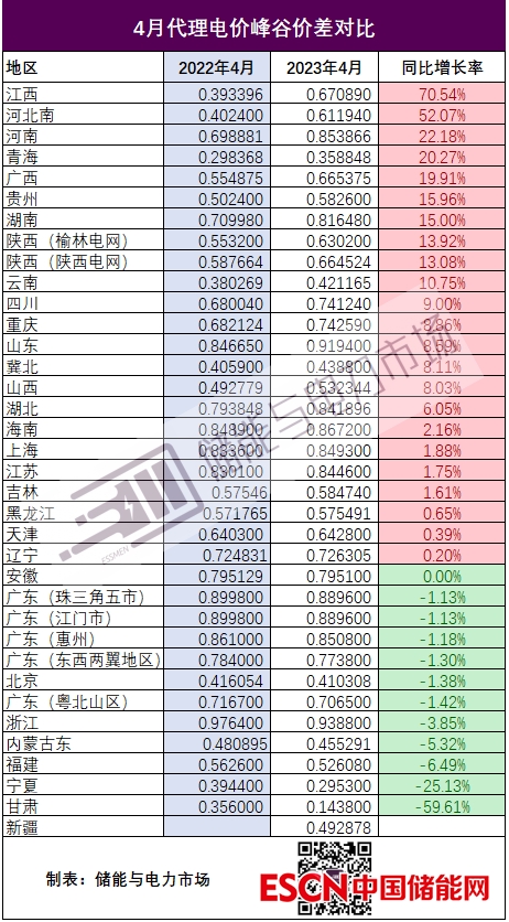 江西、河北南峰谷價差同比增長超過50%。江西同比增幅最大為70.54%;