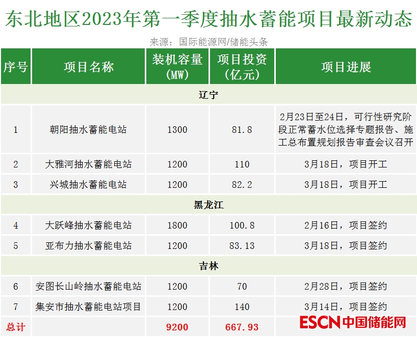 2023年一季度,東北地區(qū)有7個抽水蓄能電站更新了動態(tài),裝機(jī)總規(guī)模為9.2GW,項目總投資667.93億元。