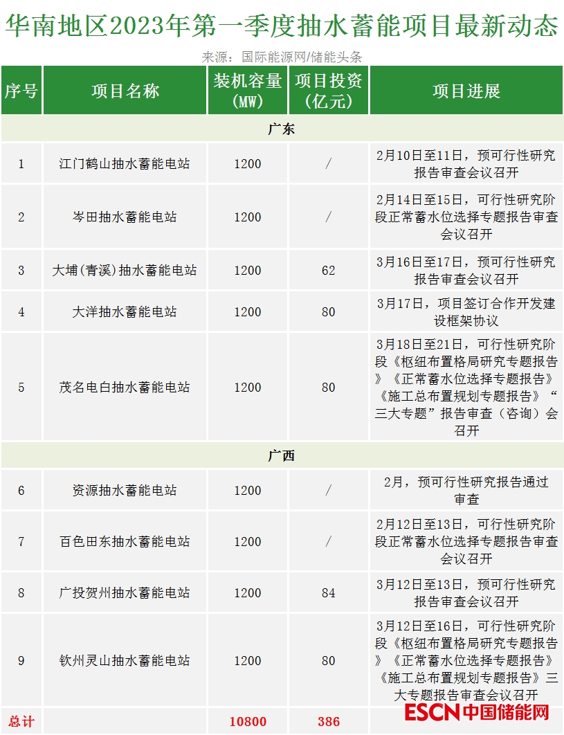 2023年一季度,華南地區(qū)有9個抽水蓄能電站更新了動態(tài),裝機(jī)總規(guī)模為10.8GW,項目總投資286億元。