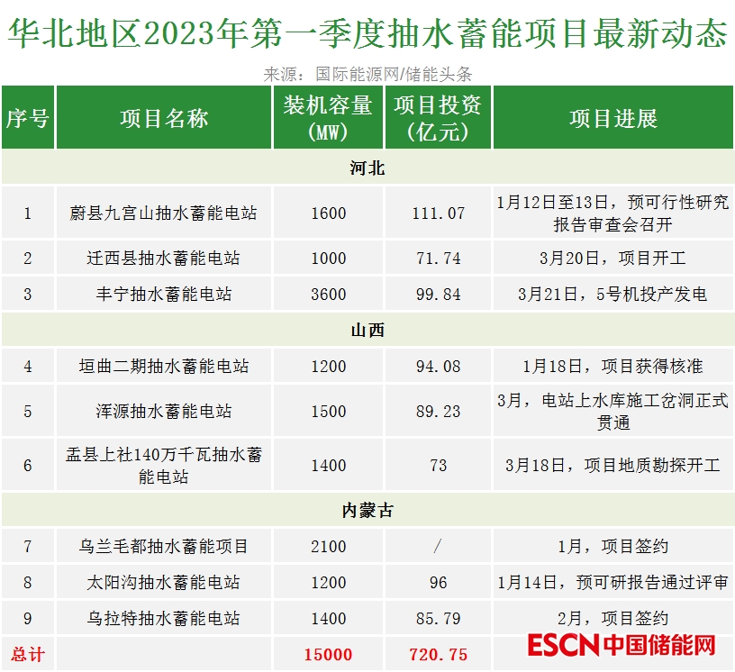 2023年一季度,華北地區(qū)有9個抽水蓄能電站有了新進(jìn)展,裝機(jī)總規(guī)模為15GW,項目總投資720.75億元。