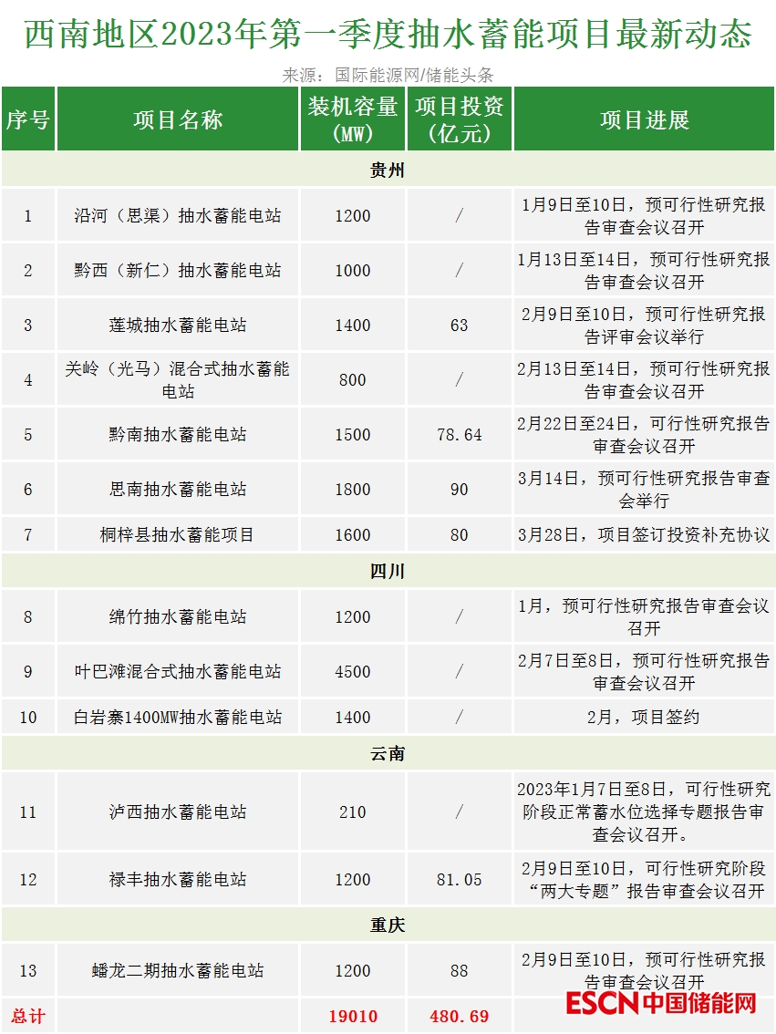 2023年一季度,西南地區(qū)有13個抽水蓄能電站更新了動態(tài),裝機(jī)總規(guī)模為19.01GW,項目總投資480.69億元。