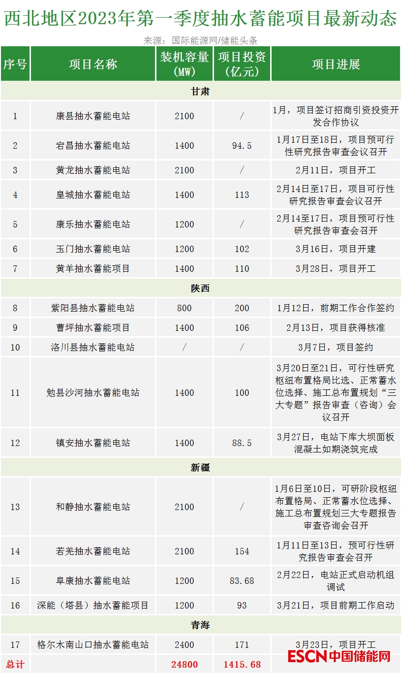 2023年一季度,西北地區(qū)有17個抽水蓄能電站更新了動態(tài),裝機(jī)總規(guī)模為24.8GW,項目總投資1415.68億元。