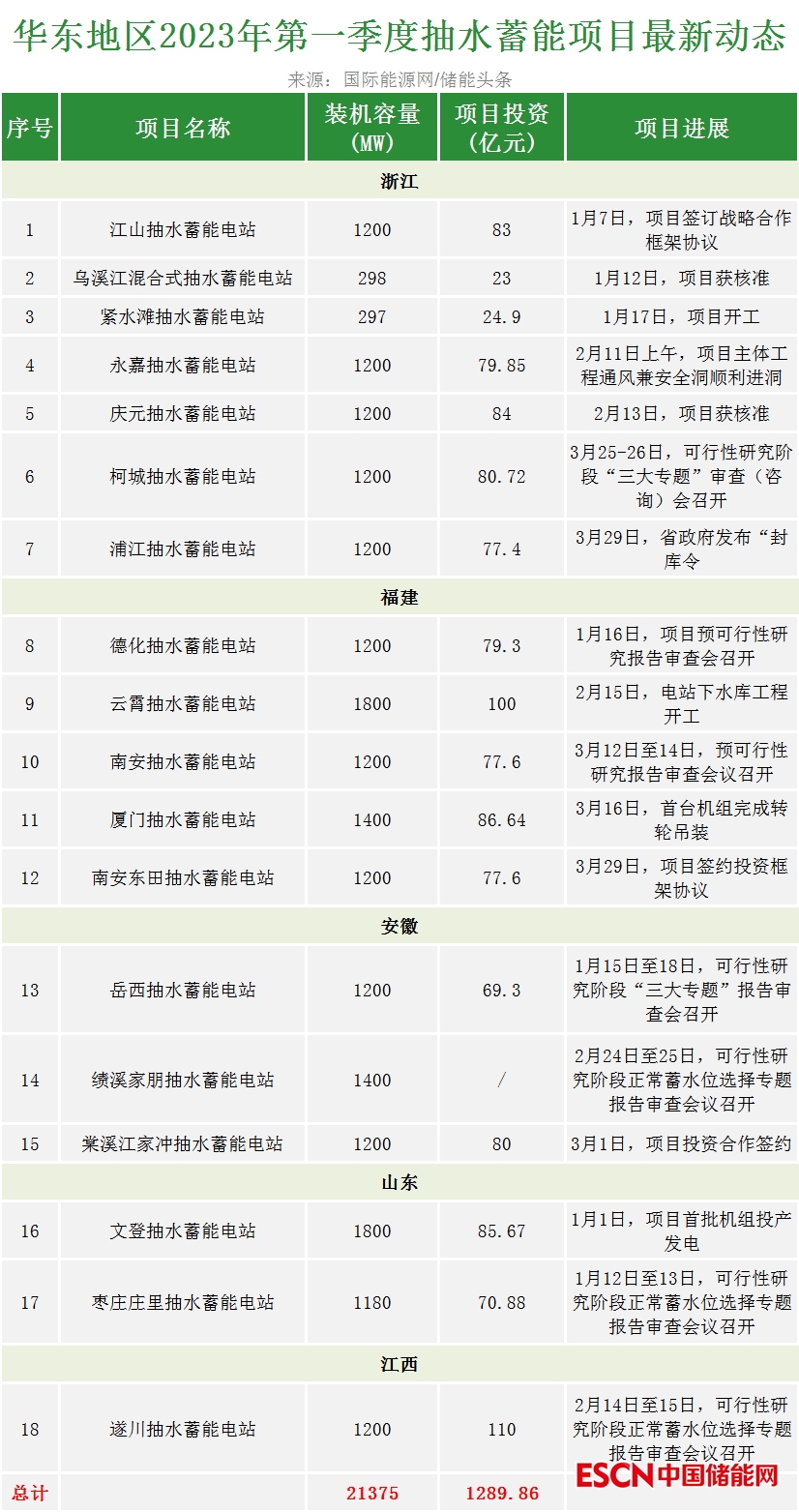 2023年一季度,華東地區(qū)有18個抽水蓄能電站更新了動態(tài),裝機(jī)總規(guī)模為21.4GW,項目總投資1289.86億元。