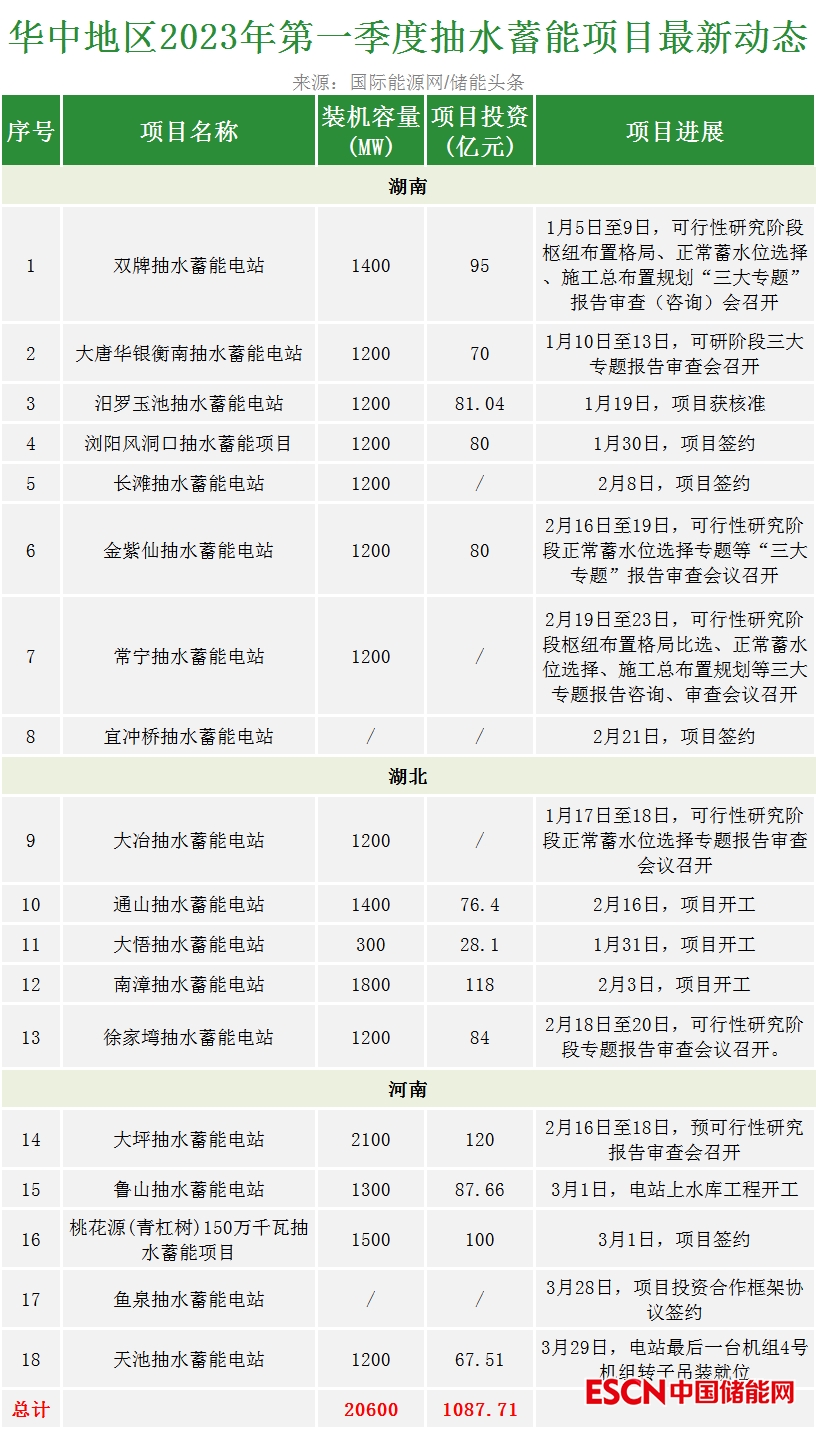 2023年一季度,華中地區(qū)有18個抽水蓄能電站更新了動態(tài),裝機(jī)總規(guī)模為20.6GW,項目總投資1087.71億元。