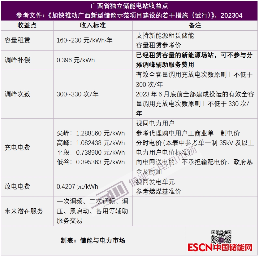 2023年4月4日,廣西發(fā)改委發(fā)布的《加快推動(dòng)廣西新型儲(chǔ)能示范項(xiàng)目建設(shè)的若干措施(試行)》更是將獨(dú)立儲(chǔ)能電站的盈利模式進(jìn)一步明確。包括容量租賃費(fèi)用標(biāo)準(zhǔn)、調(diào)峰補(bǔ)償標(biāo)準(zhǔn)、以及儲(chǔ)能電站充放電費(fèi)用,都再次詳細(xì)進(jìn)行了說(shuō)明。