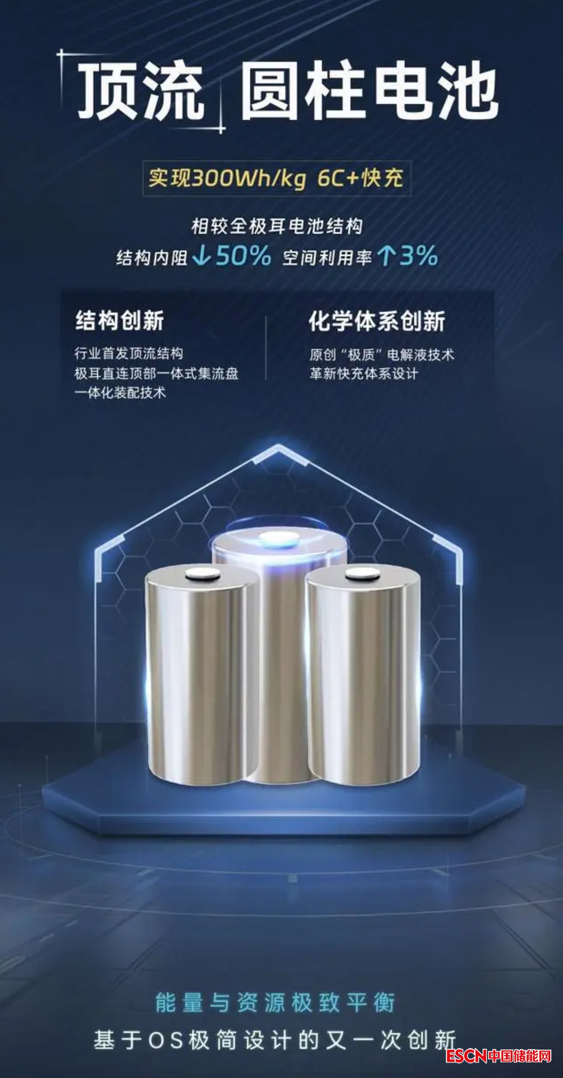 該公司稱,“頂流”圓柱電池是基于中創(chuàng)新航 One-Stop (OS) 極簡設(shè)計的又一次創(chuàng)新,通過自研結(jié)構(gòu)創(chuàng)新與化學體系創(chuàng)新研發(fā)而成。采用了行業(yè)首發(fā)頂流結(jié)構(gòu)與原創(chuàng)“極質(zhì)”電解液技術(shù),結(jié)構(gòu)內(nèi)阻相較于全極耳結(jié)構(gòu)下降 50%,能量密度可達 300Wh/kg,實現(xiàn) 6C + 快充,電池性能大幅提升。