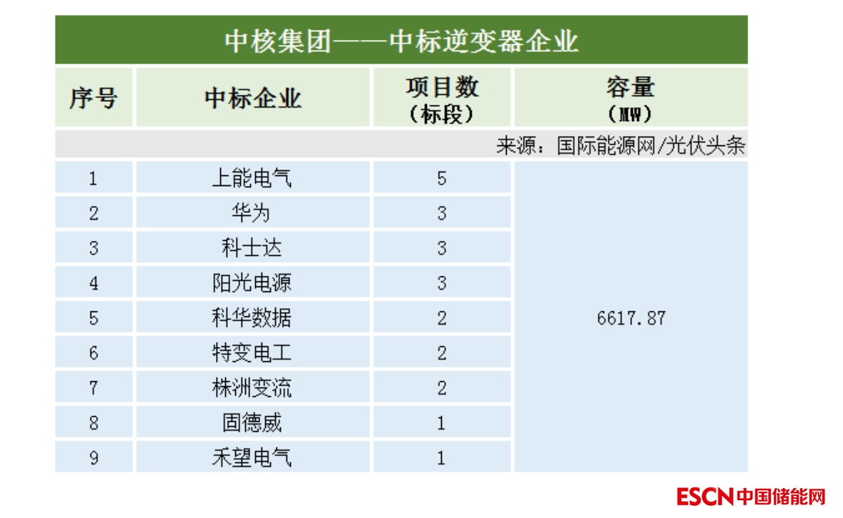 3月1日-3月31日,中核集團(tuán)有5個(gè)項(xiàng)目定標(biāo),確定定標(biāo)容量6617.86MW。其中,中核匯能2023年度逆變器設(shè)備集中采購,確定了中標(biāo)候選人。該集采項(xiàng)目采購容量6600MW,上能電氣、華為、科士達(dá)、陽光電源、科華數(shù)據(jù)、特變電工、株洲變流、固德威、禾望電氣等9家入圍。