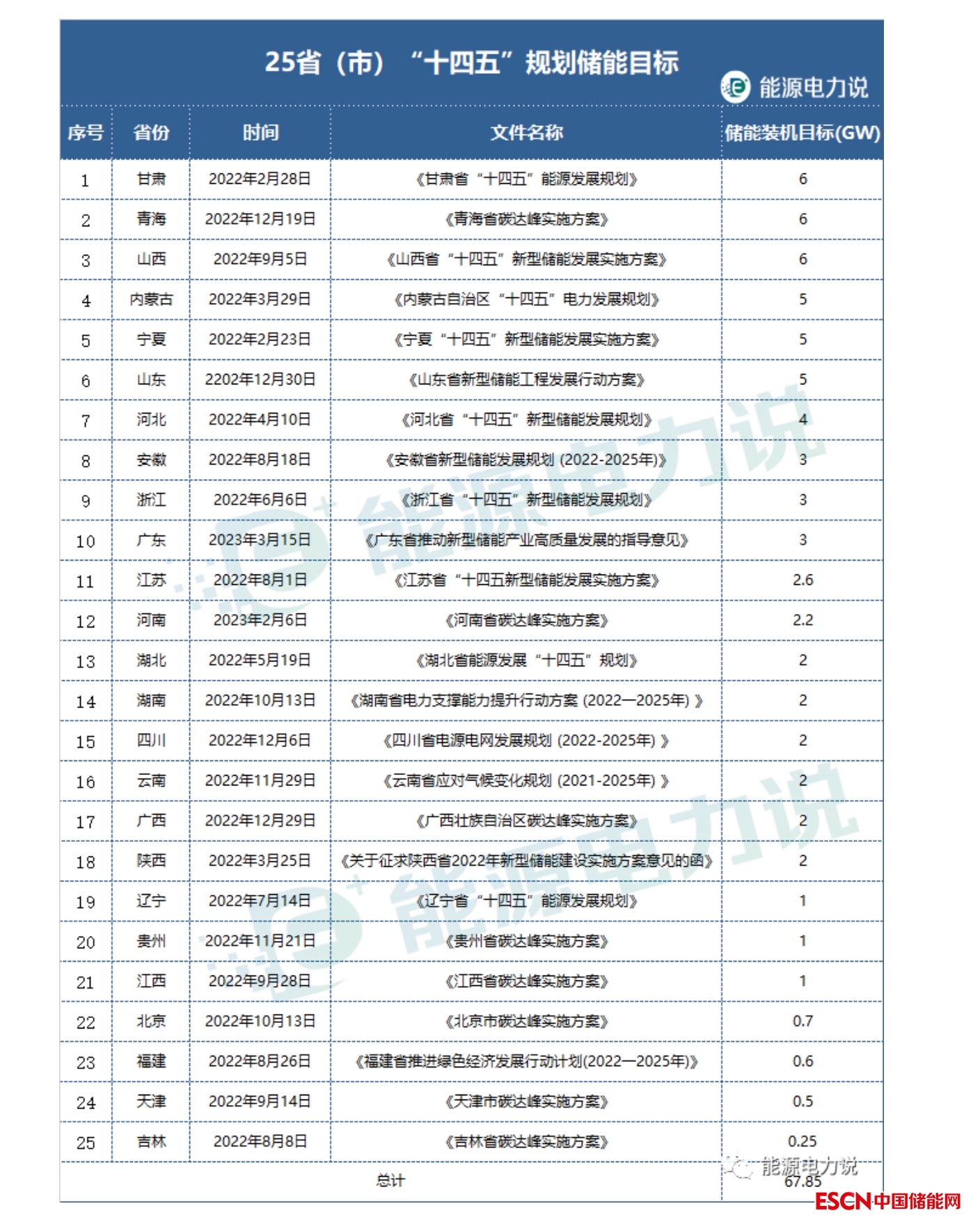 “十四五”是儲(chǔ)能由商業(yè)化初期向規(guī)模化發(fā)展轉(zhuǎn)變的關(guān)鍵階段。目前,已有25個(gè)省(市)規(guī)劃了“十四五”期間的新型儲(chǔ)能裝機(jī)目標(biāo)及具體規(guī)劃,到2025年,預(yù)計(jì)新型儲(chǔ)能裝機(jī)目標(biāo)將達(dá)到67.85GW。青海、甘肅、山西的儲(chǔ)能規(guī)模最大,預(yù)計(jì)新型儲(chǔ)能裝機(jī)將達(dá)到6GW;山東、寧夏和內(nèi)蒙古緊隨其后,預(yù)計(jì)新型儲(chǔ)能裝機(jī)將達(dá)到5GW。