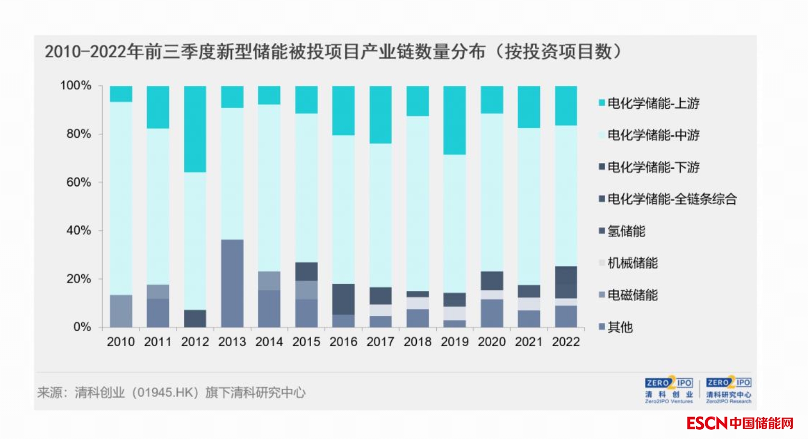 全部被投項(xiàng)目中,5.1%為產(chǎn)業(yè)鏈各環(huán)節(jié)均有所涉足的綜合性儲能企業(yè),15.5%為專注于上游相關(guān)材料和零部件【1】制造的企業(yè),35.2%專注于中游包括電池在內(nèi)的儲能裝置【2】的生產(chǎn),24.3%的項(xiàng)目可以提供集成后的儲能系統(tǒng)產(chǎn)品【3】,5.6%為在產(chǎn)業(yè)鏈下游運(yùn)營儲能項(xiàng)目的企業(yè)。電化學(xué)儲能領(lǐng)域中,投資布局向中游集中更為明顯,超過70%的被投項(xiàng)目處于產(chǎn)業(yè)鏈中游,下游被投項(xiàng)目占比不足1%。