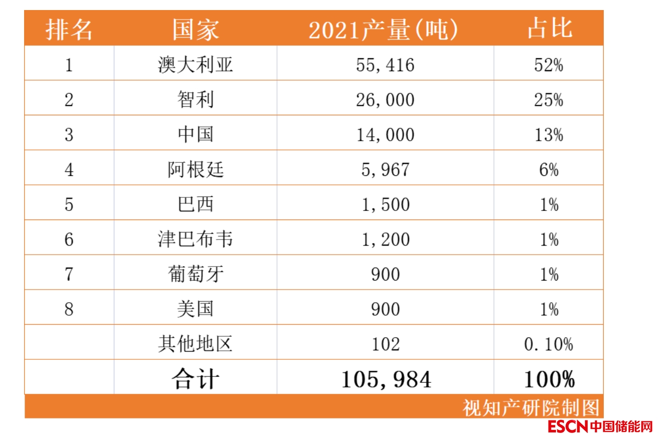 2021年,全球鋰產(chǎn)量首次超過100,000噸,是2010年的四倍,其中大約90%來自三個國家。其中,澳大利亞生產(chǎn)了世界上52%的鋰,排名第一。