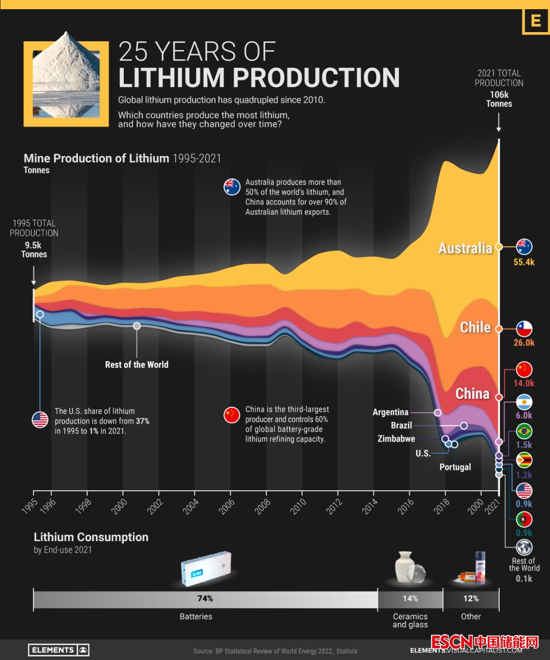 下圖是visualcapitalist根據(jù) BP 的《世界能源統(tǒng)計評論》中的數(shù)據(jù),繪制了 1995 年至 2021 年各國家超過 25 年的鋰產(chǎn)量圖表。
